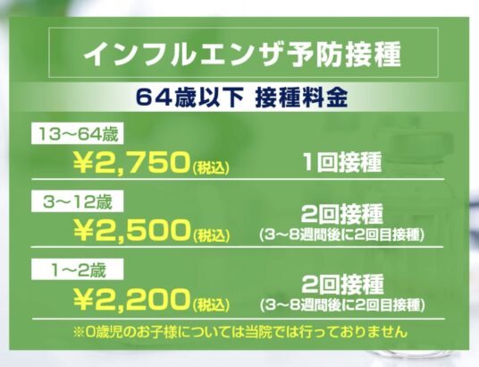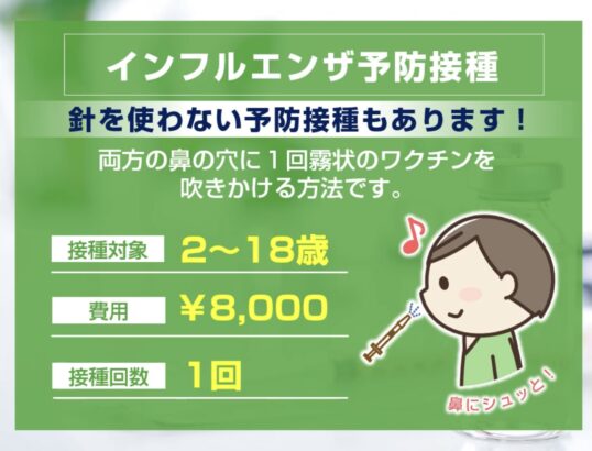 昨年から始まっております経鼻の生ワクチン(フルミスト)も当院で接種可能です。数に限りがありますのでお早めにご予約いただければと思います。